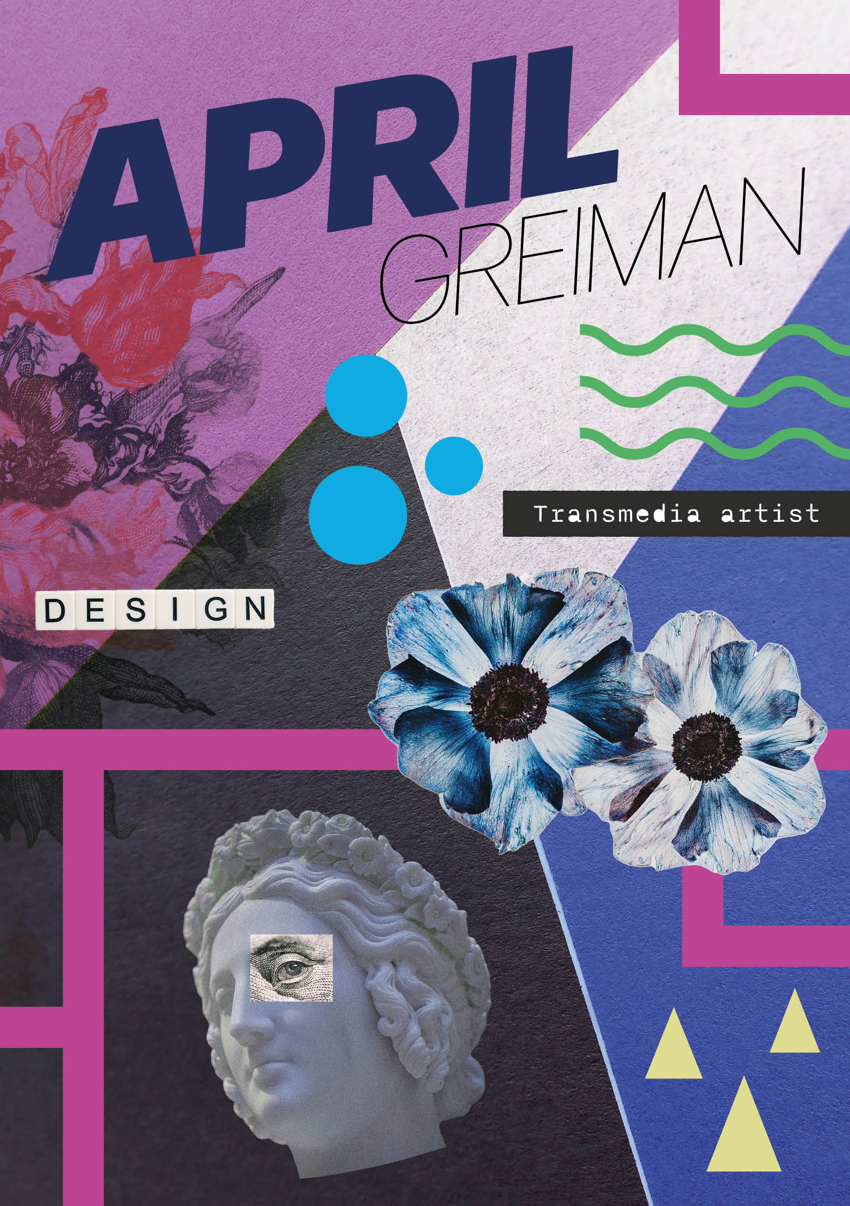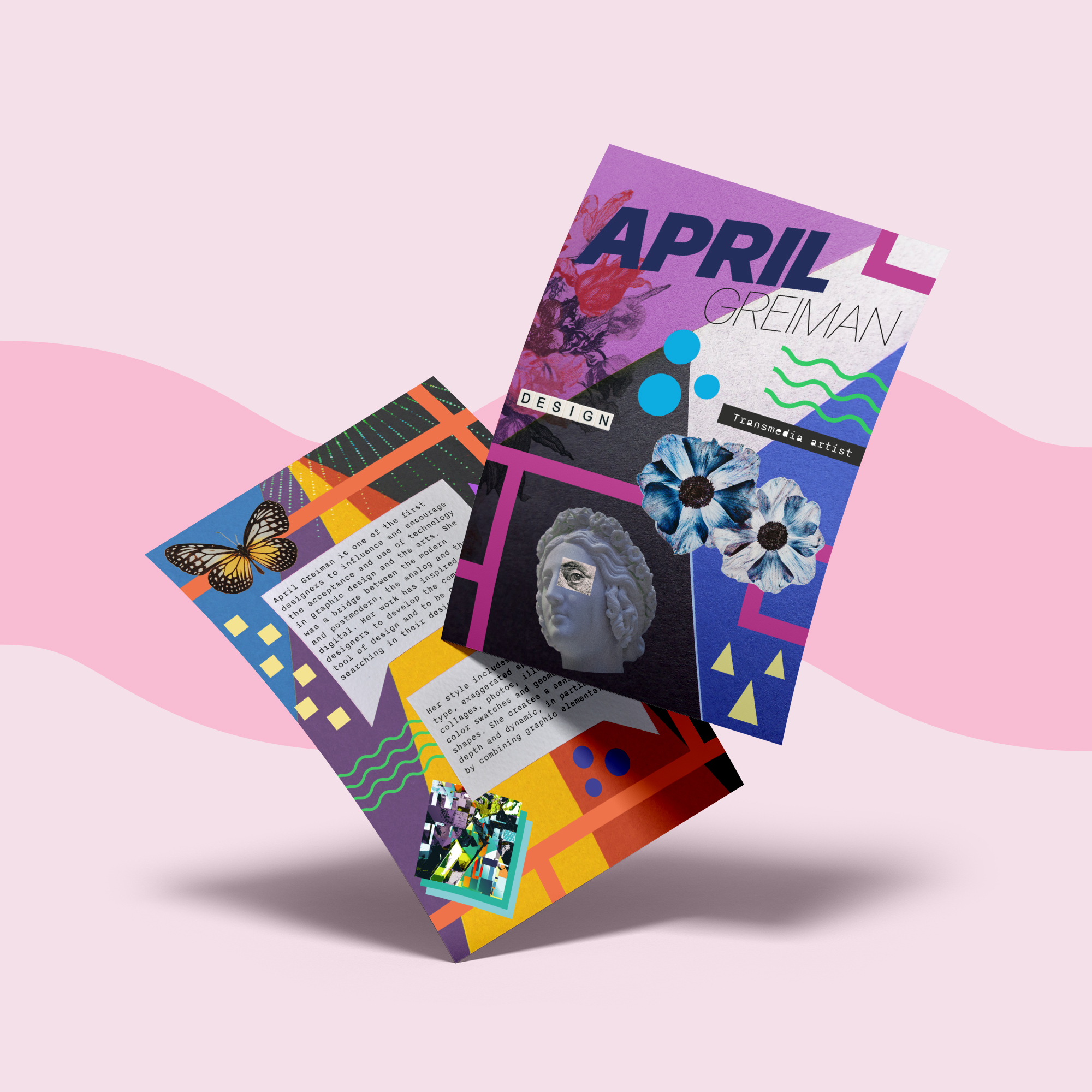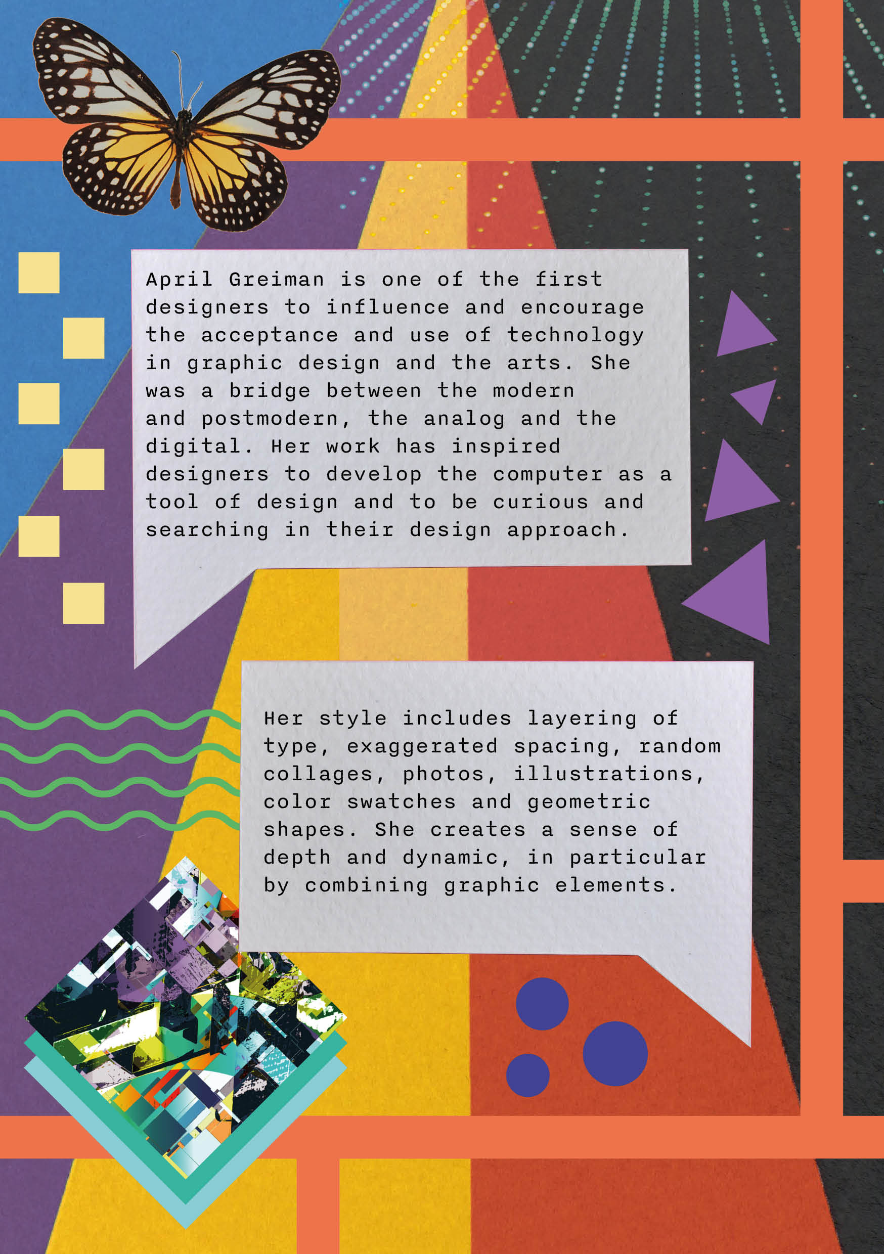 Er is gekozen voor grafisch ontwerpster April Greiman. Haar stijl bestaat uit verschillende lagen, waarbij typografie, overdreven spatiëring, willekeurige collages en geometrische vormen met elkaar gecombineerd worden. Deze elementen creëren samen een gevoel van diepte en dynamiek. In het ontwerp van de flyer is de gelaagdheid die April Greiman in haar werk gebruikt toegepast. Daarbij zijn verschillende afbeeldingen, typografie, kleuren en geometrische vormen gecombineerd om een geheel te vormen.