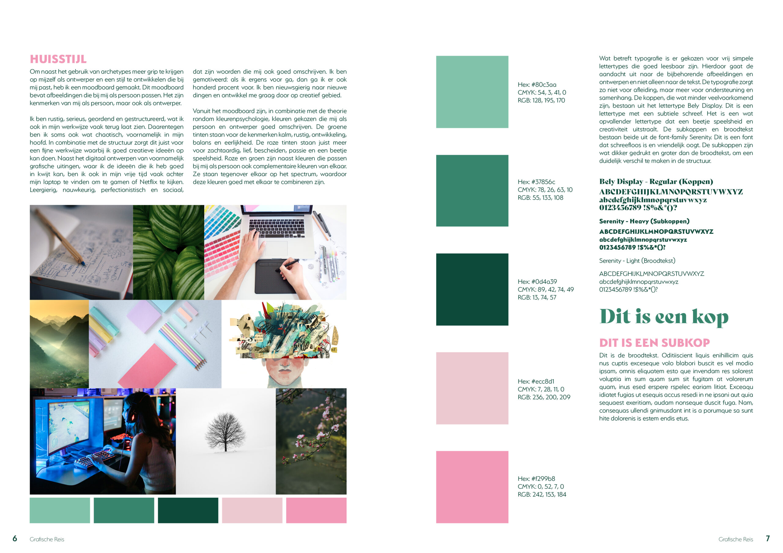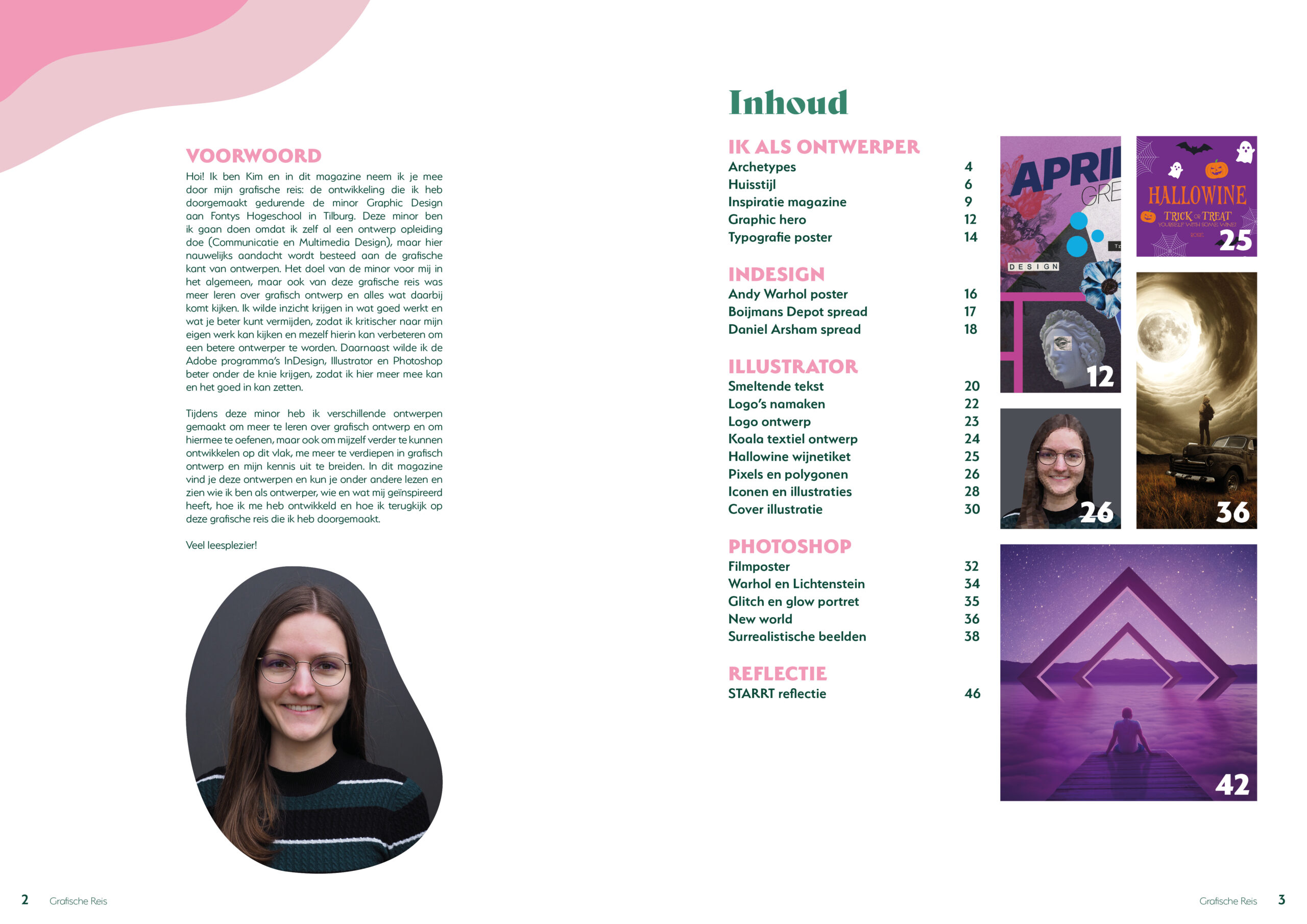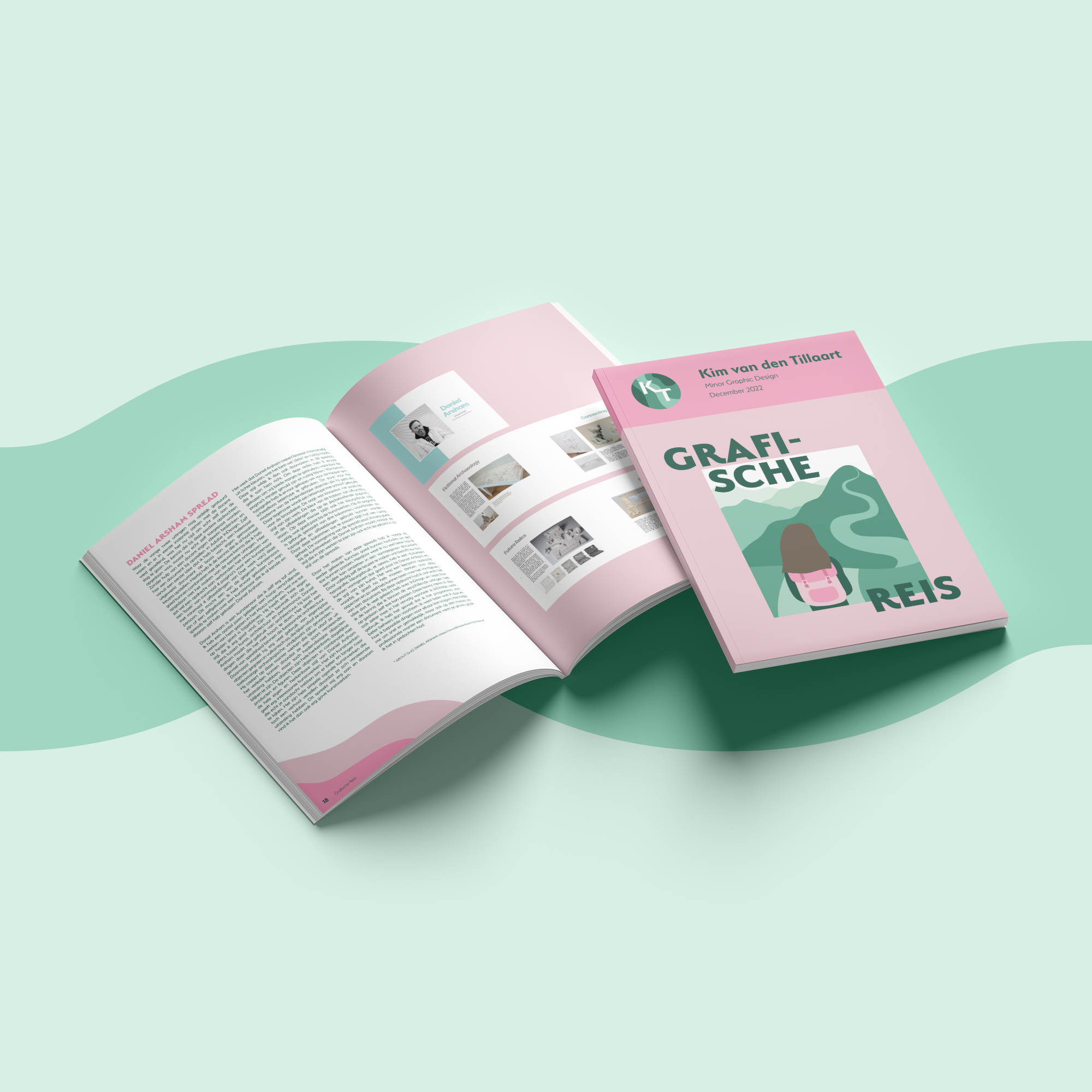 Het ontworpen magazine laat de grafische reis zien die tijdens de minor is doorgemaakt. Het bevat verschillende opdrachten en ontwerpen die gemaakt zijn om de kennis op het gebied van grafisch ontwerp uit te breiden. Het laat zien wie ik ben als ontwerper, wie en wat mij geïnspireerd hebben, hoe ik me heb ontwikkeld en hoe ik terug kijk op al deze aspecten. Ook de stijl van het magazine is hierop afgestemd, het laat mijn identiteit als persoon én ontwerper zien. De vormgeving is rustig, geordend en gestructureerd, maar met een vrolijk en creatief randje. Het magazine heeft een simpele lay-out, waarbij de kolommen zorgen voor een overzichtelijk, geordend geheel. Hier en daar wordt gebruik gemaakt van speelse vormen om een balans te creëren tussen structuur en speelsheid, om zo de creativiteit wat meer naar voren te laten komen.