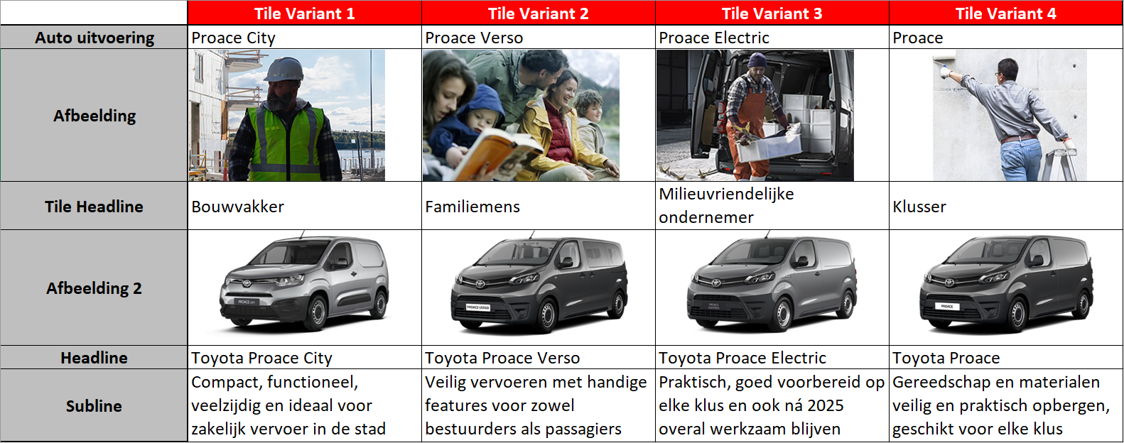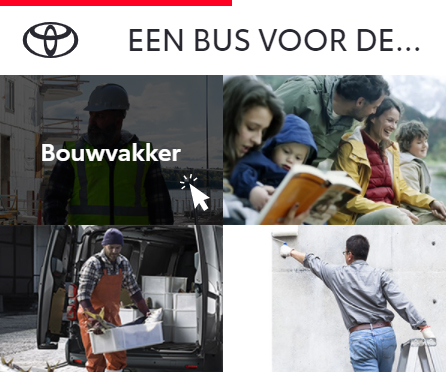 Gamification is het gebruik van (kleine) spelelementen in een context die zelf geen game is. Het zorgt voor meer interactie, om de ervaring van passief naar actief te veranderen. De banner toont vier categorieën die ieder voor een bepaalde groep gebruikers staan, met daaraan een specifieke Toyota Proace gekoppeld. Zo wordt de gebruiker aangetrokken om te interacteren met de banner en te bekijken welke bus bij een bepaalde keuze hoort.